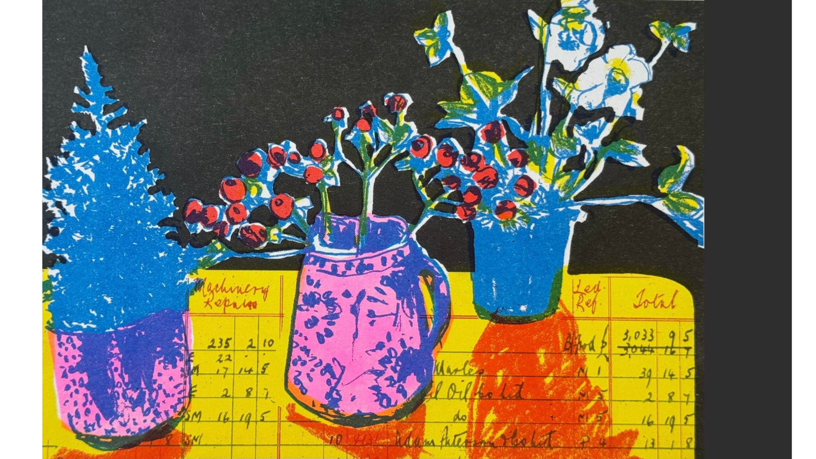 First, in the over 19’s we have Mark Parker, a textiles teacher and painter, whose riso print (a highly energy efficient and sustainable printing method) celebrates the smallest Christmas tree in the world (Mark lives in a small city centre flat) and also features collaged pages from a vintage ledger rescued from a skip outside a mill in the Scottish Borders.