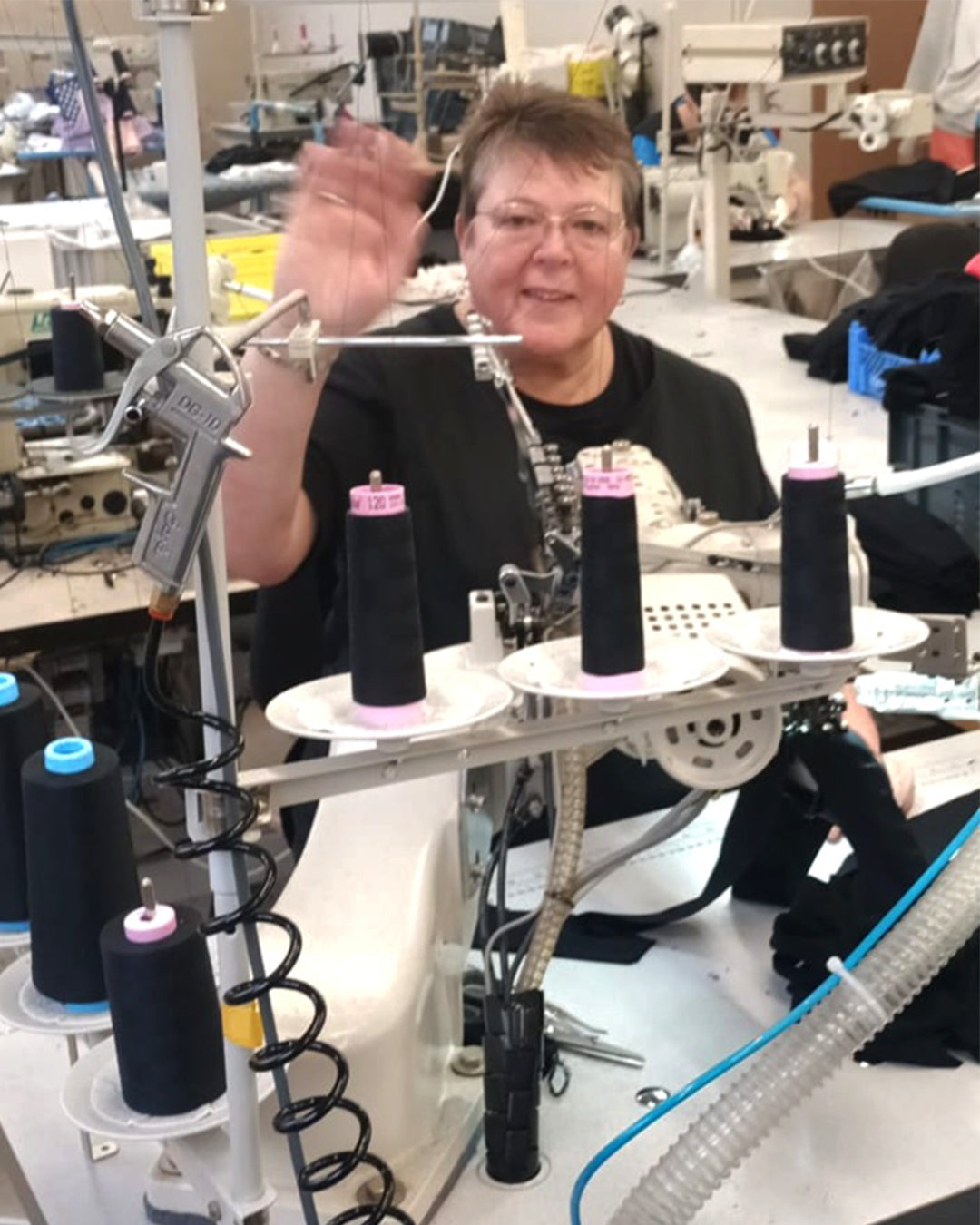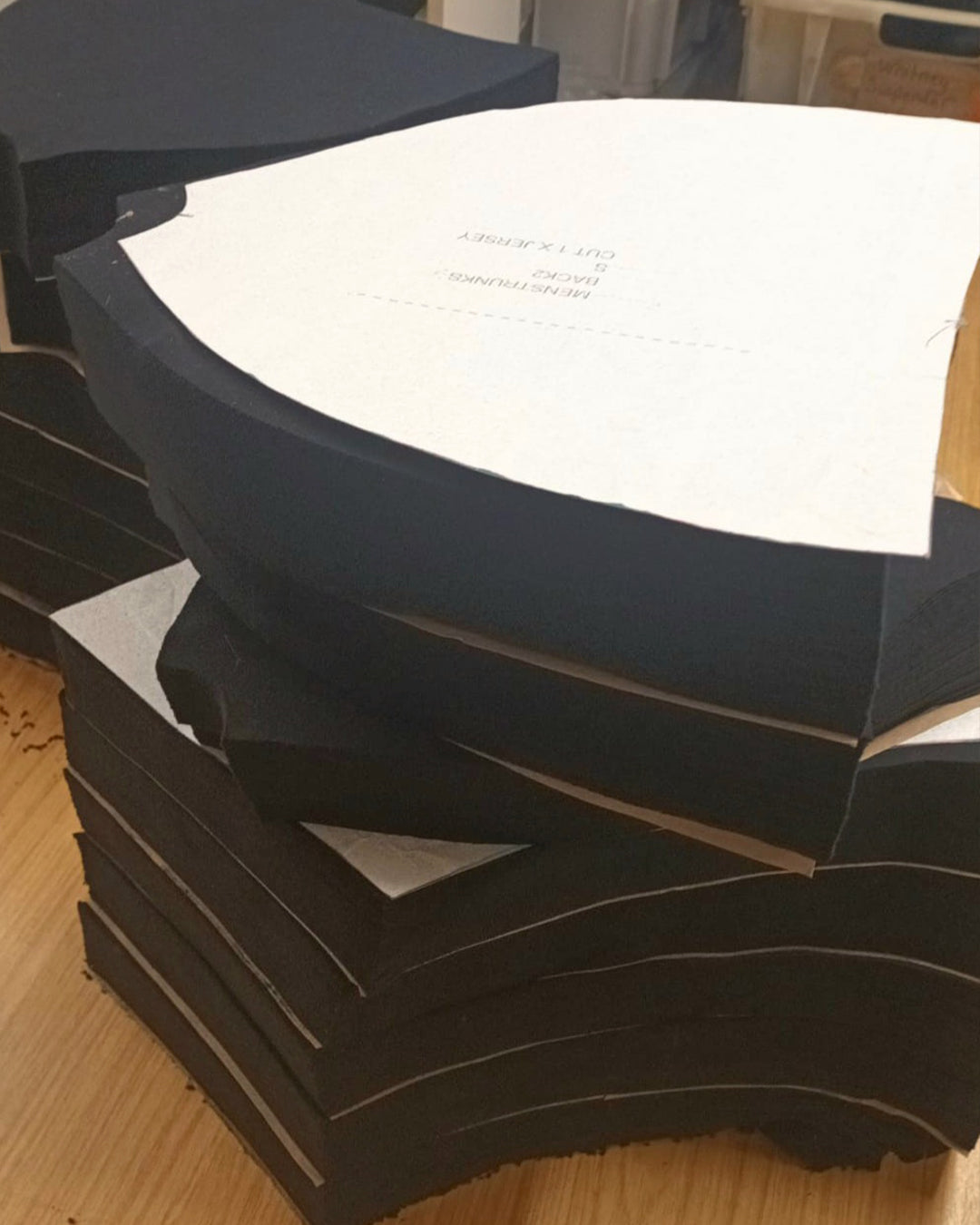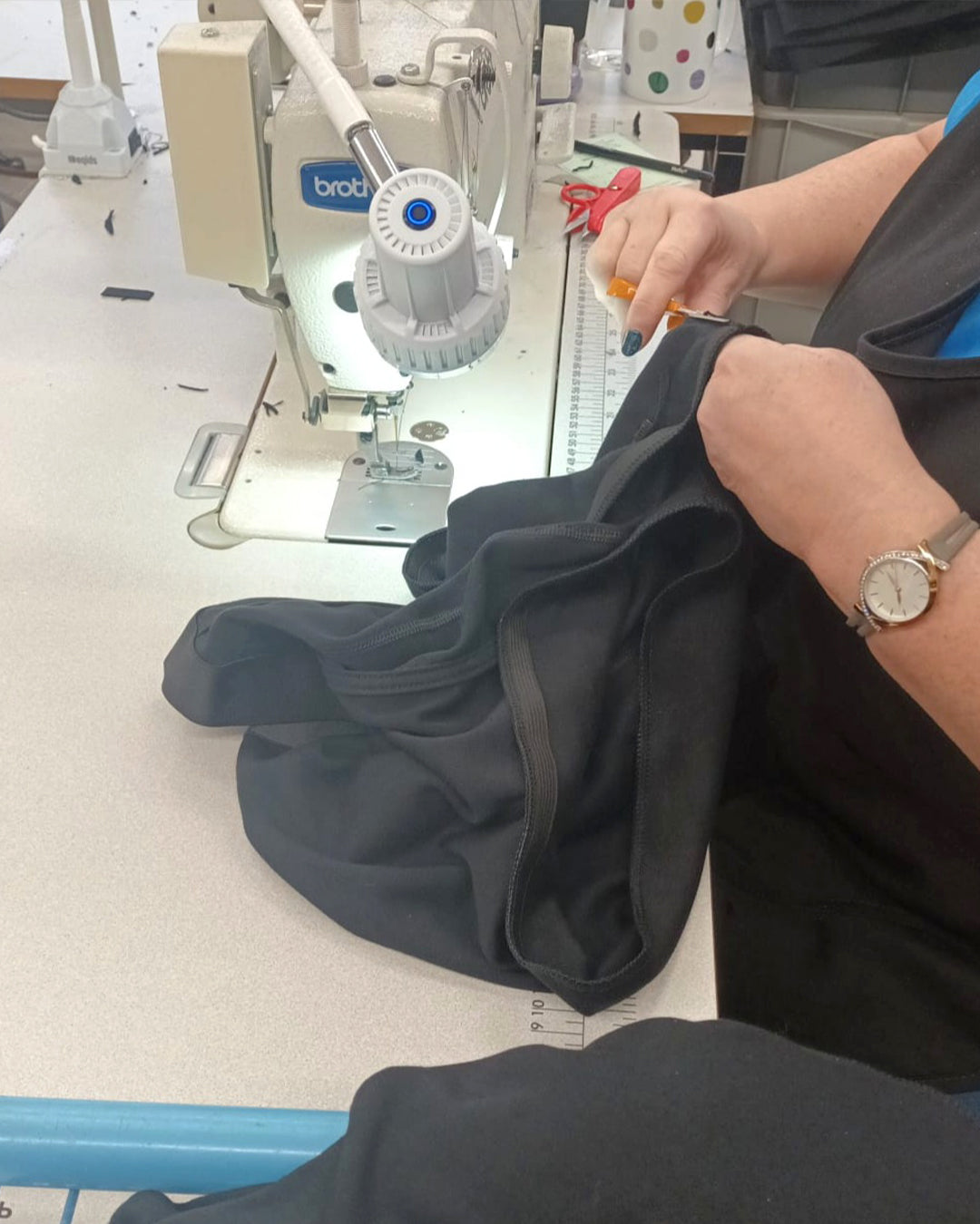 But the team have been working flat out now for months. Adam who does all the cutting and manages the production has taken a few pics. Here are Amanda, June, Jill and Hellen, this week, as you can see, mostly making men’s black trunks.