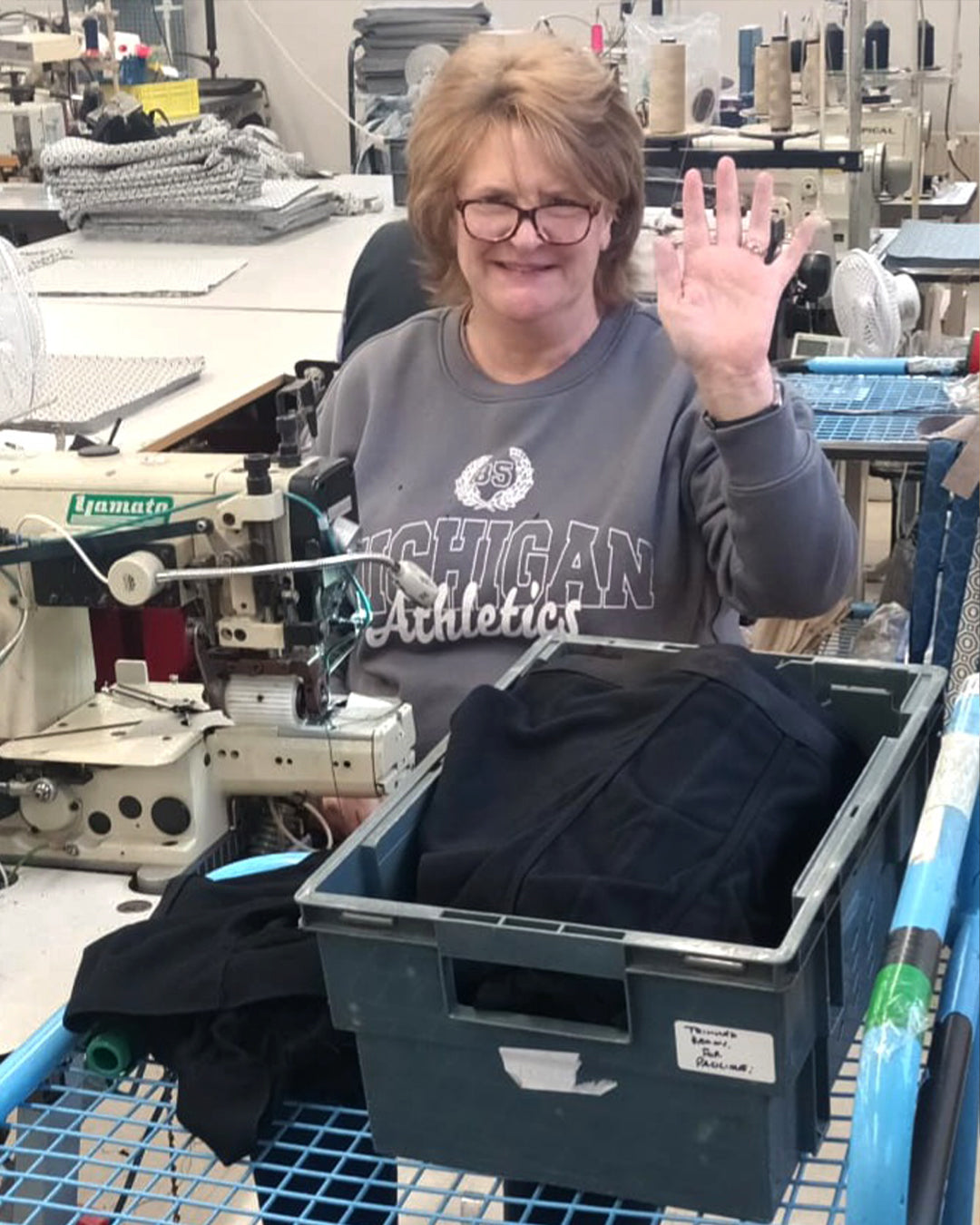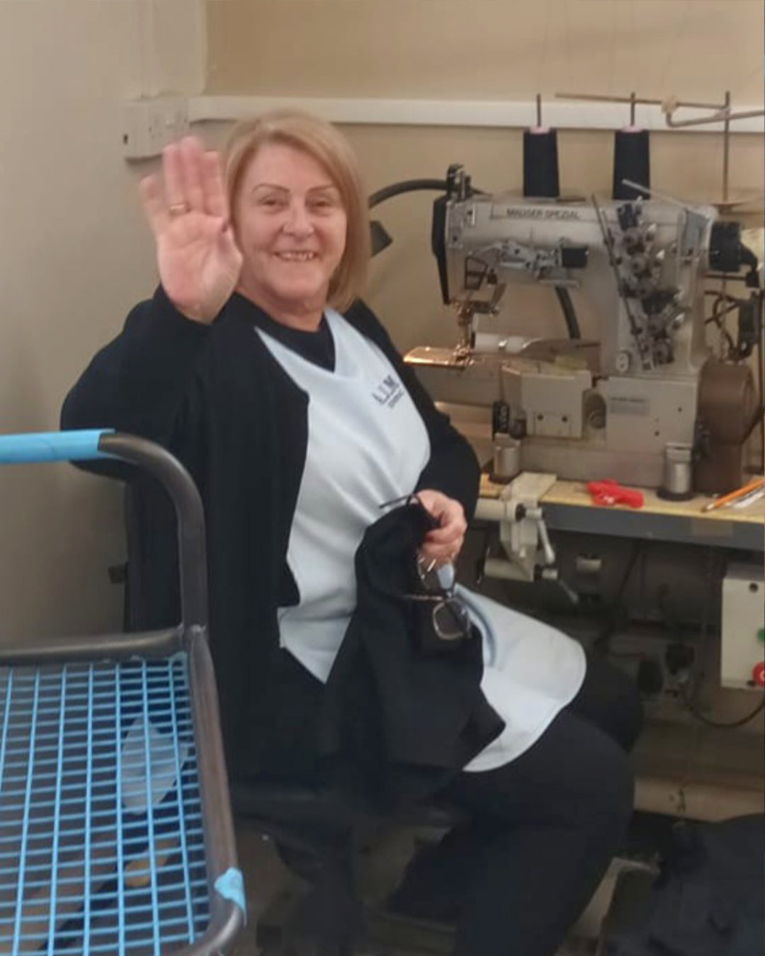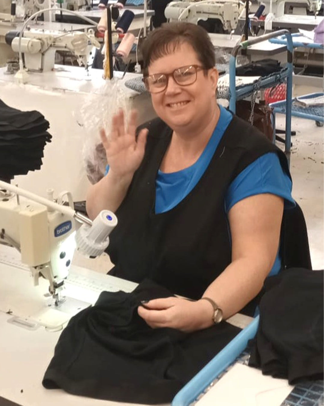 But the team have been working flat out now for months. Adam who does all the cutting and manages the production has taken a few pics. Here are Amanda, June, Jill and Hellen, this week, as you can see, mostly making men’s black trunks.