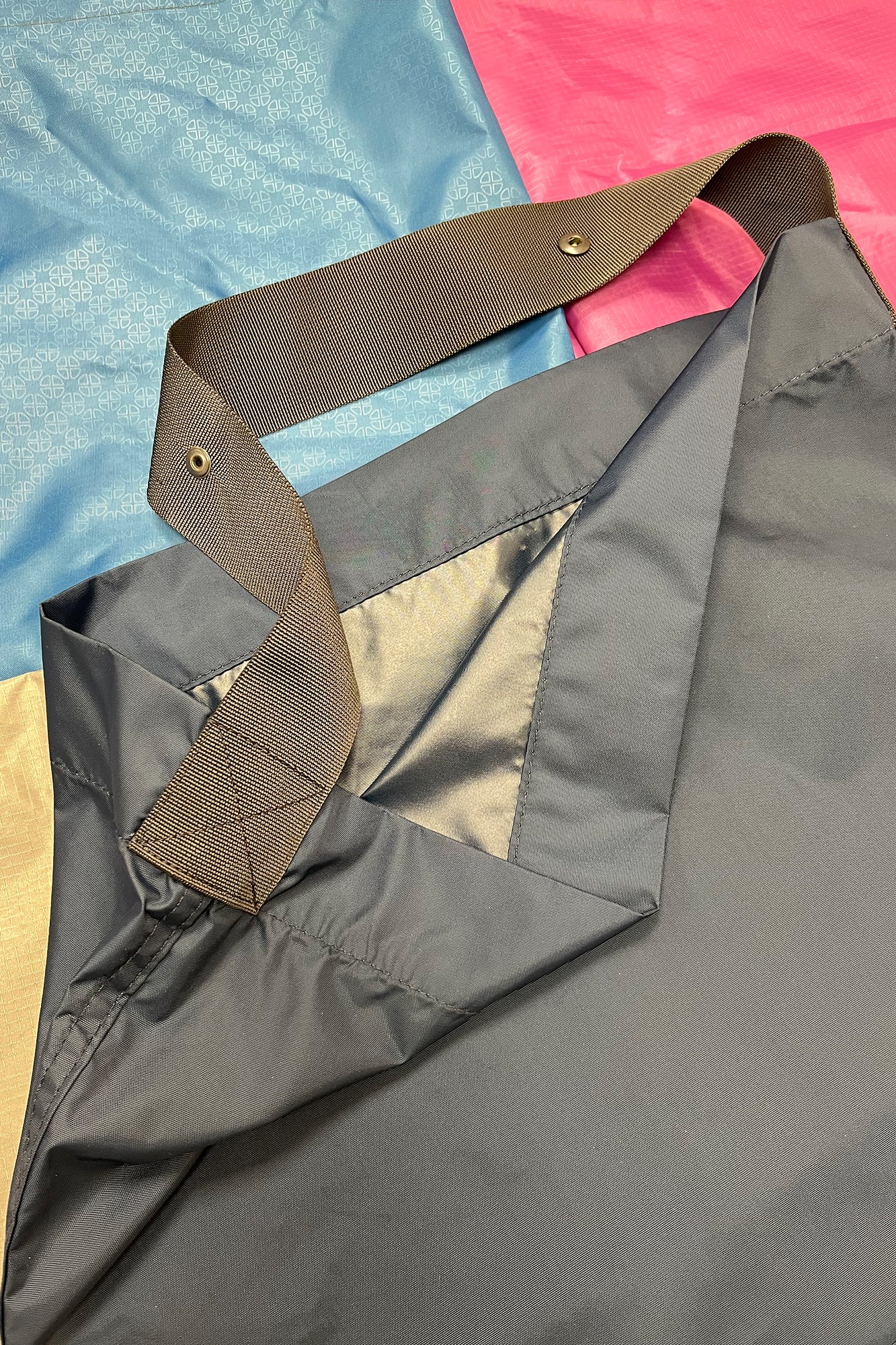 The fabric used in this bag is deadstock material, the strap iss nylon webbing. This product is limited edition.