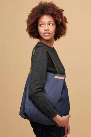 The denim pack-a-sack is made from lightweight denim, and the strap is nylon webbing.