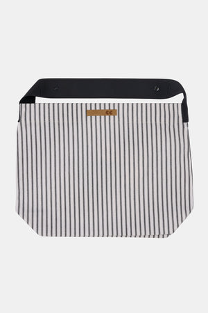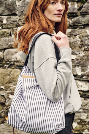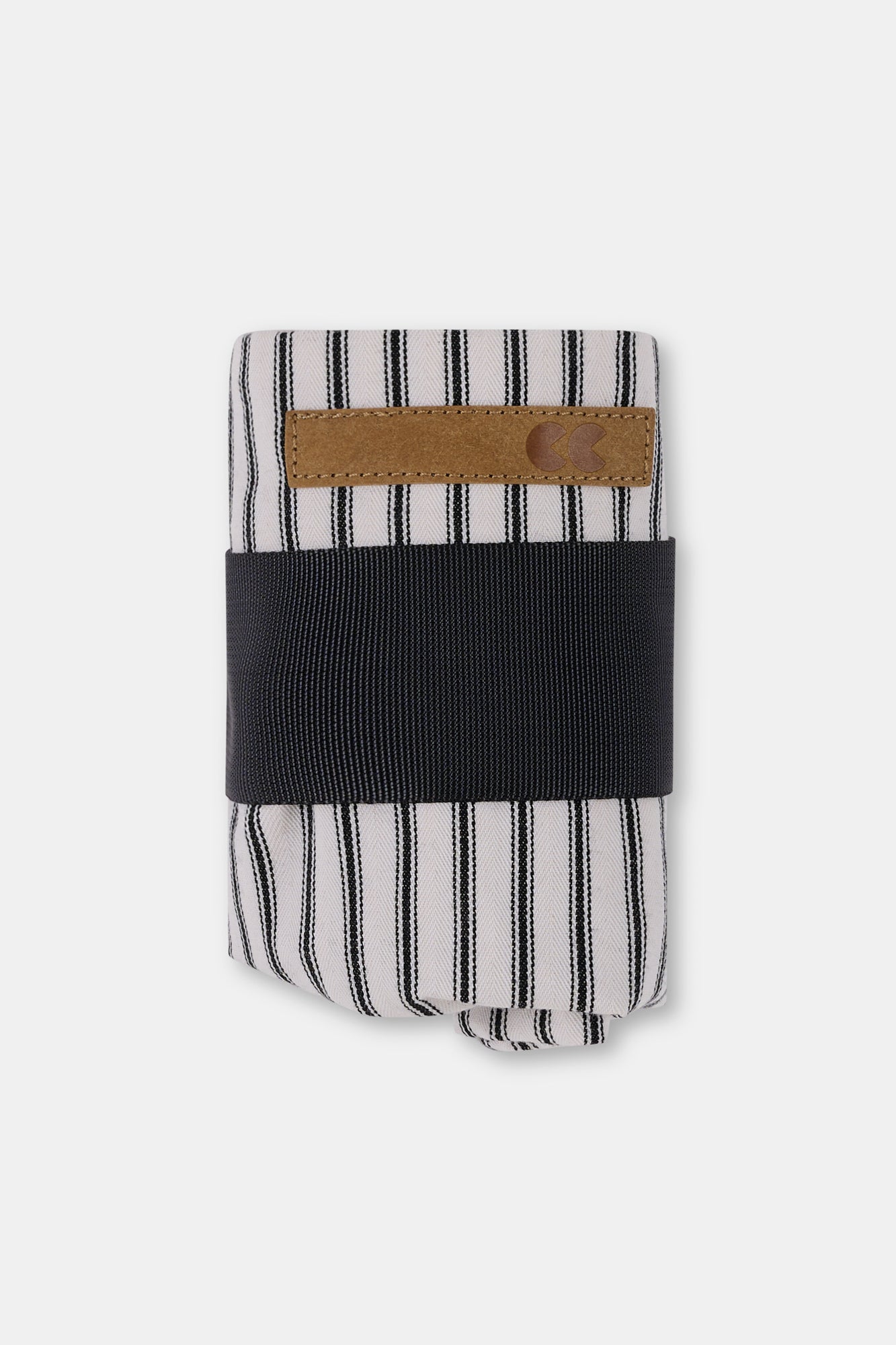 This pack-a-sack is made from deadstock cotton ticking, and the strap is nylon webbing. This product is limited edition.