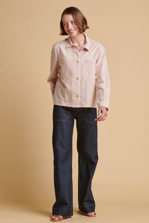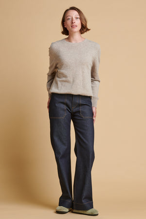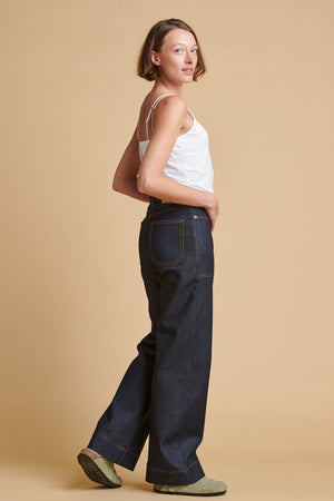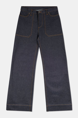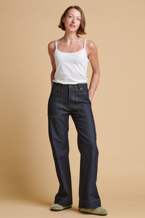 70s style jean, high waist, wide leg, zip fly and rivets.