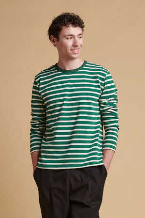 Yarn spun in Dukinfield, jersey knitted in Leicester, cut and sewn in Blackburn.