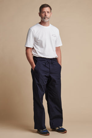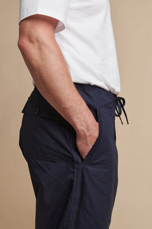 Loose fit tie-top summer trousers with two side pockets and one back pocket with button, they have a button fastening and a button fly.