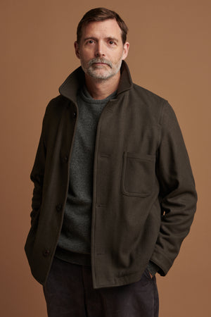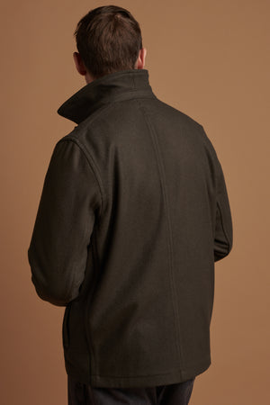 Unlined, collared, wool jacket with four button fastening. One chest pocket and one internal chest pocket, two side welt pockets.