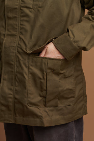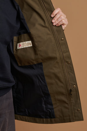 200g, 100% Showerproofed Cotton Sahara 6 by British Millerain. Lining 65% Polyester, 35% Cotton. Sleeve - 94% Viscose, 4% Acetate. This fabric is fluorocarbon free, certified to Oeko-Tex® Standard 100, and compliant with European REACH and California Prop 65 regulations.