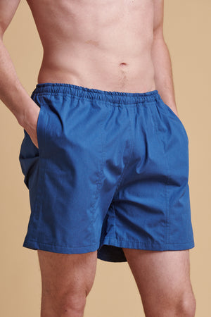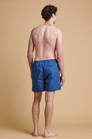 Classic swim short with two side and one back pocket with button. Cotton mesh liner, elasticated waist with draw cord.