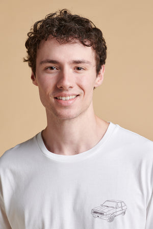 White t shirt ribbed neck, short sleeve, car graphic print.