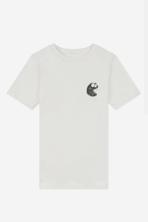 White t shirt with ribbed neck, short sleeve, black graphic print.