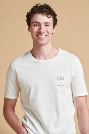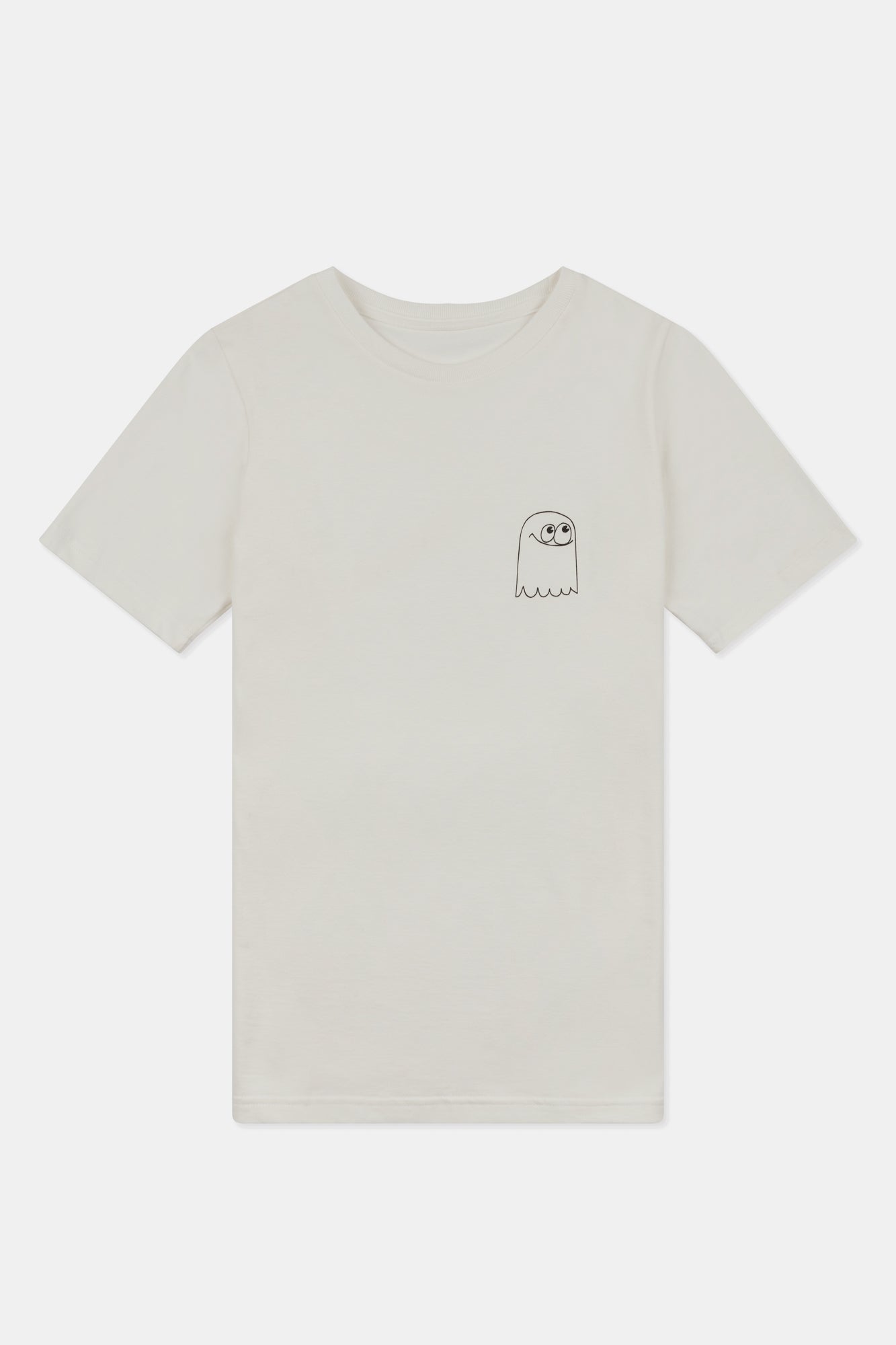 White t shirt with ribbed neck, short sleeve, black graphic print.