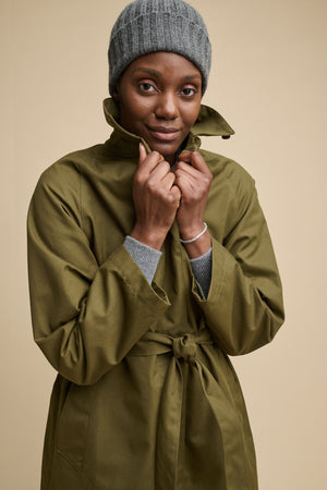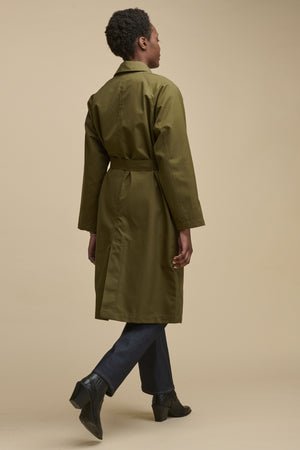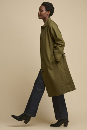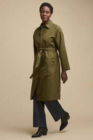 Calf length raglan fly front raincoat with belt and back vent. Half lined with two front welt pockets.