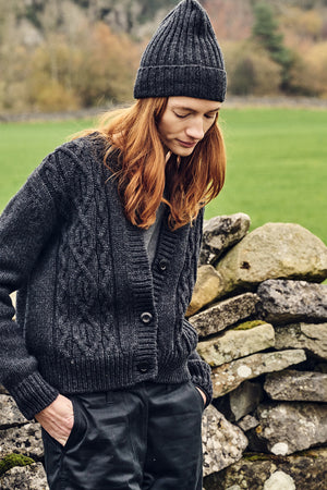 Button front crew neck cable cardigan.