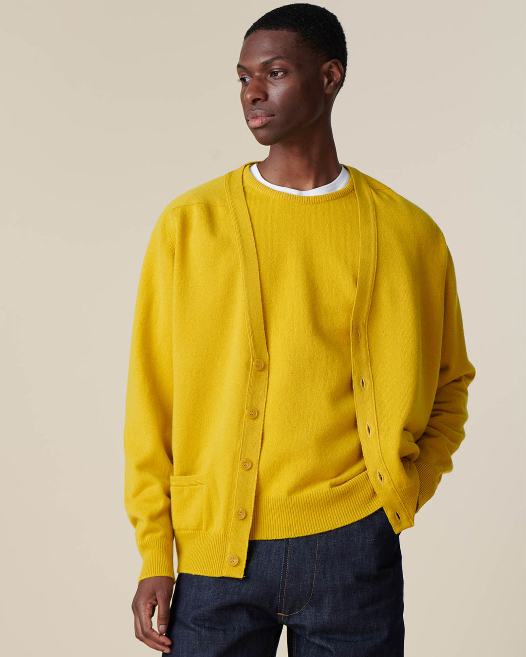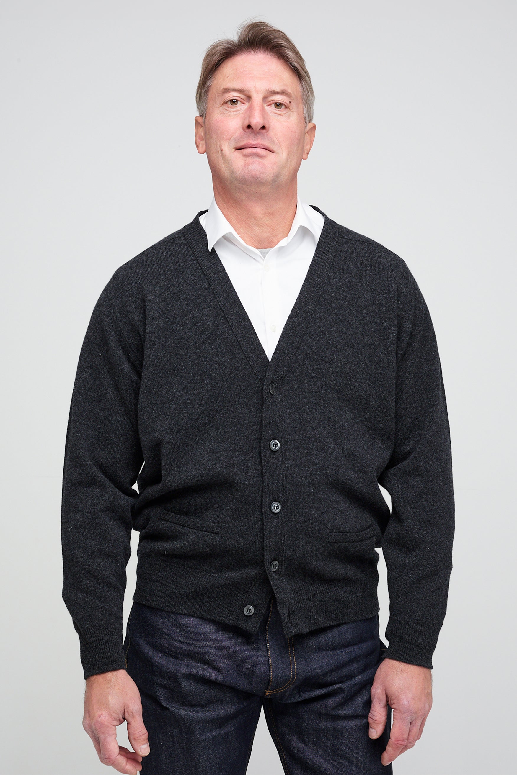 Our men’s cardigans are cut from a classic block and feature a five-button reinforced placket and two front pockets. Knitted in Hawick in Scotland by a knitter with generation of experience on knitting great quality cardi’s they are warm, naturally breathable and ideal for layering.
