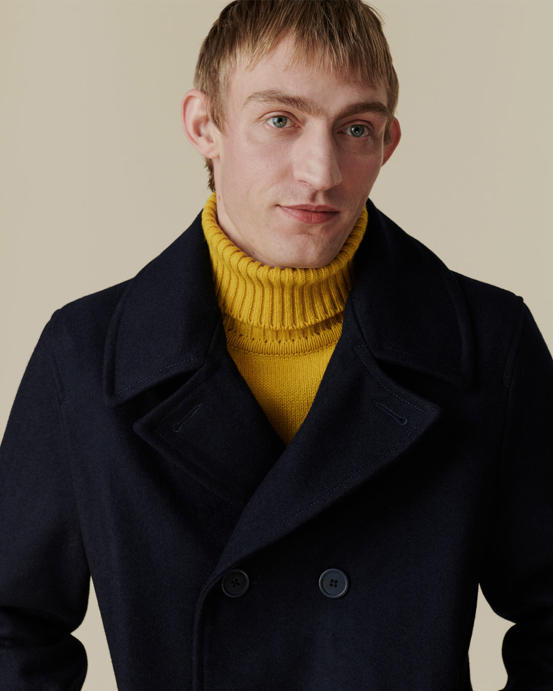 Our wool peacoat is a made from start to finish here in England. Australian merino is carded, spun, woven, dyed and finished in Leeds in Yorkshire before crossing the Pennines to be cut and sewn in neighbouring Lancashire, in two factories with a combined heritage of over 400 years.