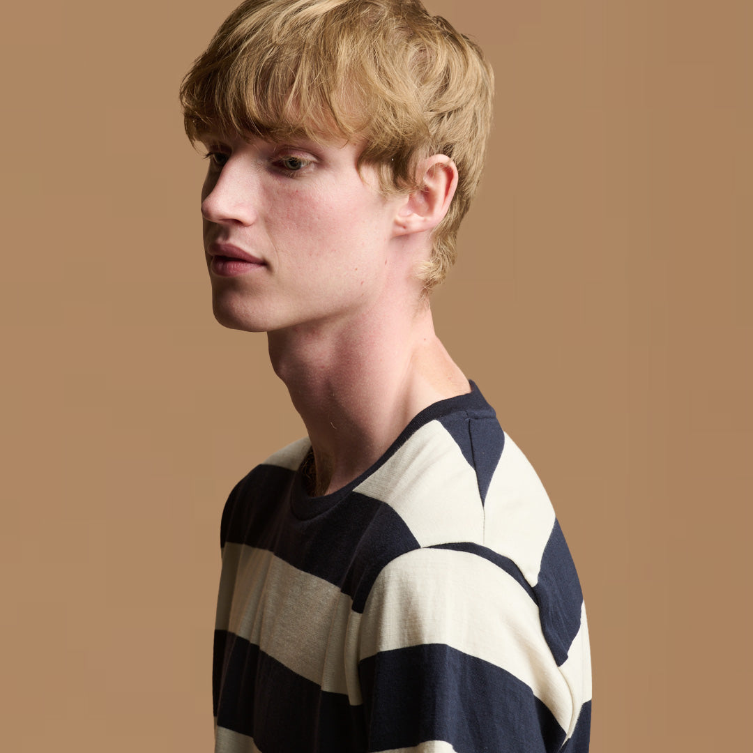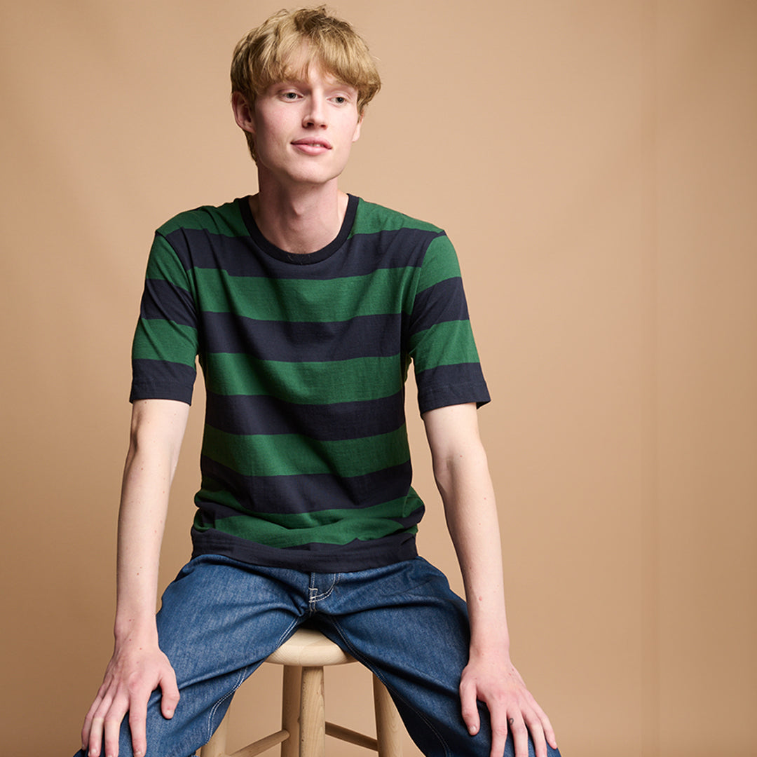 You loved our fantastic cotton tee in small stripes, how do you fancy it in BIG ones? Four great colours, made in our premium UK made 100% cotton jersey, cut and sewn in Lancashire.
