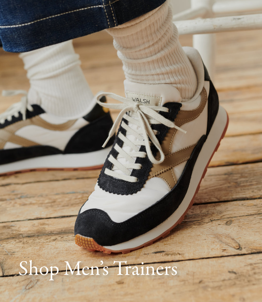 The Community Clothing X Walsh shoes for Community Clothing are a reworking of a classic 1980’s running shoe from the extensive Walsh Archive. It is called the Beacon, after Beacon Fell a popular Lancashire landmark. They're made with a super tough, breathable Cordura upper, leather and suede finished natural rubber sole and a gold foiled CC logo.