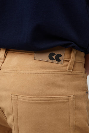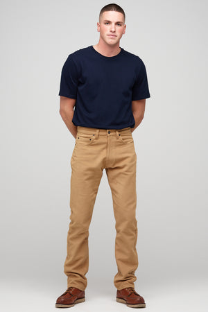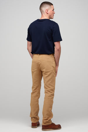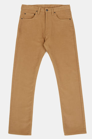Classic five pocket moleskin jean using the same block pattern as our straight cut jean, fully riveted, zip fly, chain-stitched hem, felled seams.