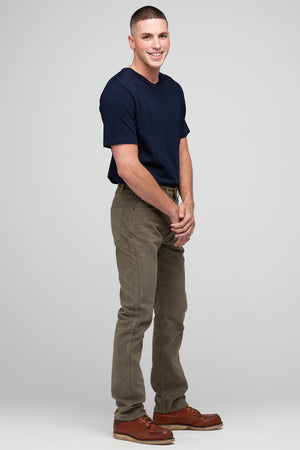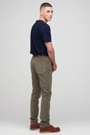 Classic five pocket moleskin jean using the same block pattern as our straight cut jean, fully riveted, zip fly, chain-stitched hem, felled seams.