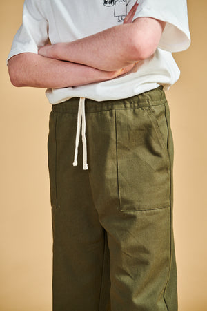 265g 100% organic cotton twill, 100% cotton trims and thread, natural rubber waistband, zero plastic material