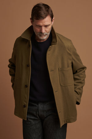 Unlined, collared, wool jacket with four button fastening. One chest pocket and one internal chest pocket, two side welt pockets.