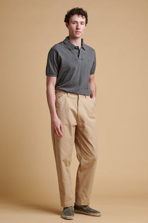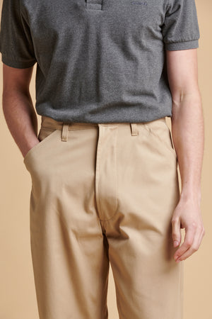 Relaxed fit, with higher waist and tapered leg. Available in one leg length (34" inseam) that can be worn full length or with a roll up.
