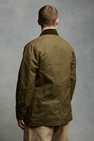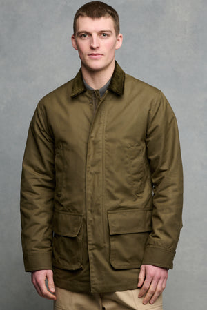 Corduroy collar, two external patch pockets, two external hand warmer pockets, internal pocket, adjustable cuffs.