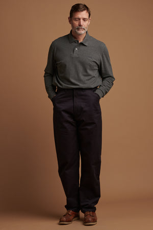 Relaxed fit, with higher waist and tapered leg. Patrick is wearing 36W Regular
