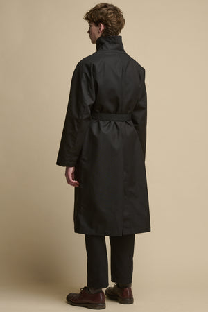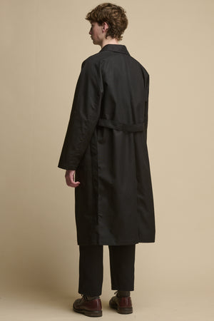 Calf length raglan fly front raincoat with belt and back vent. Half lined with two front welt pockets.