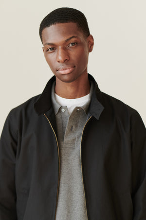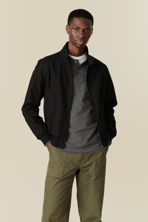 Zip front, two button stand collar, ribbed cuff and waistband, fully lined, single internal pocket The harrington is fully lined in a 65% polyester, 35% cotton satin lining
