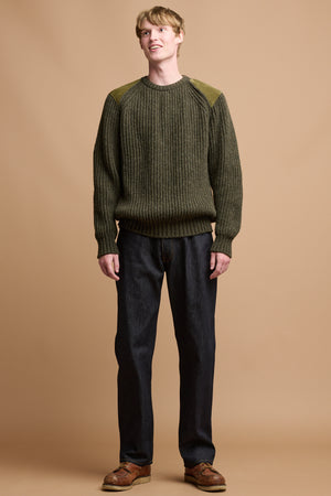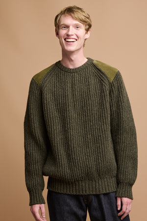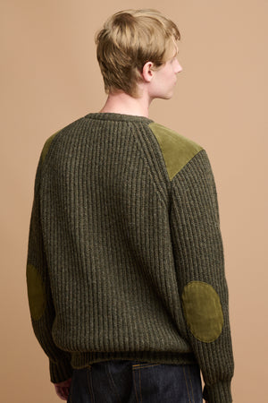 Ribbed knit jumper with raglan sleeves and suede shoulder and elbow patches for durability, inspired by the traditional fisherman’s jumper.