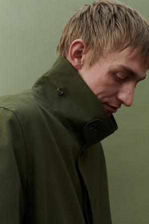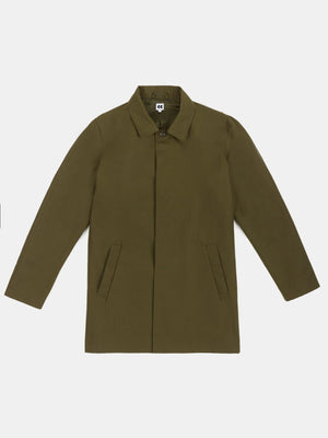 Three quarter length. Detachable collar strap. 2 side welt pockets. Concealed button placket. Half lined