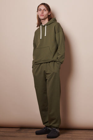 Medium weight 335g 100% organic cotton loopback jersey. 100% cotton drawstring. Fabric knitted and dyed in Leicester.