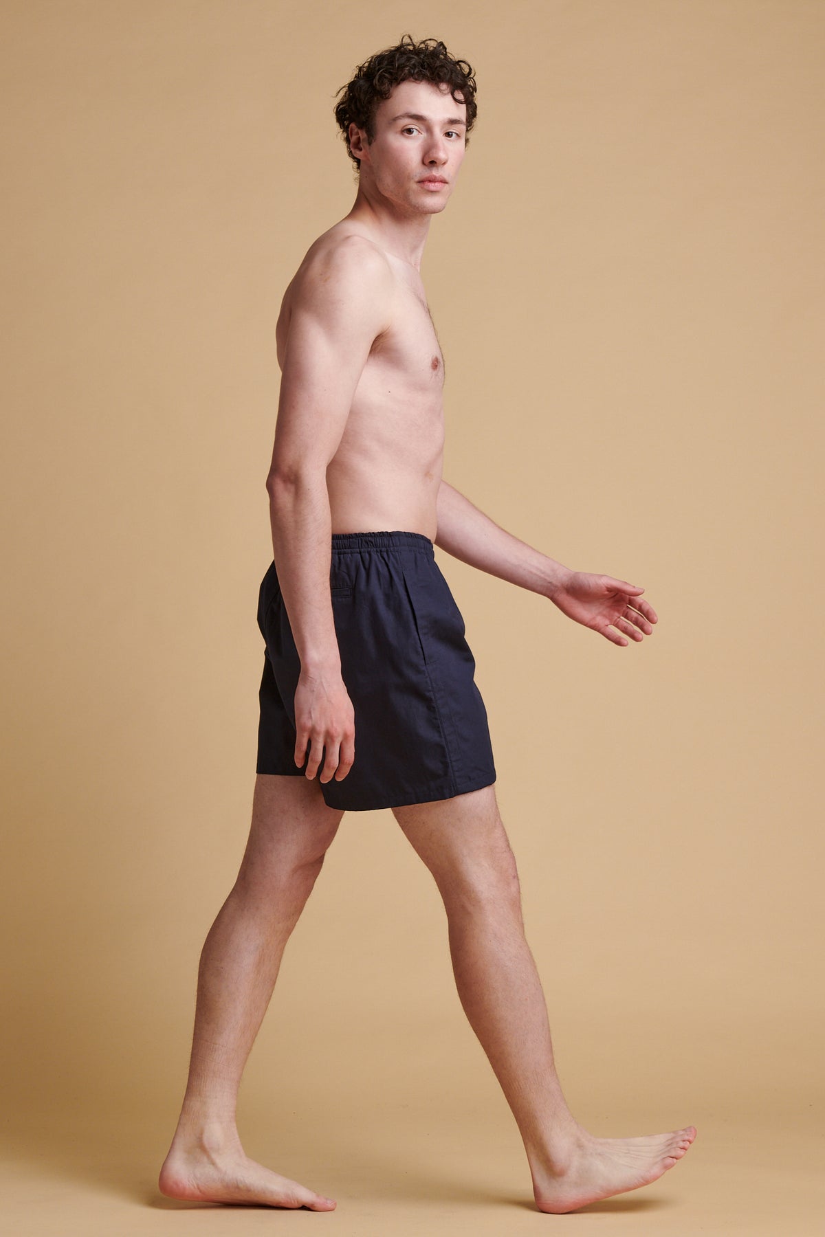 Classic swim short with two side and one back pocket with button. Cotton mesh liner, elasticated waist with draw cord.
