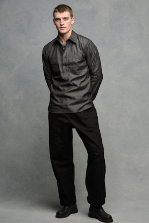 Long sleeve, half placket, two patch pockets, single button cuff