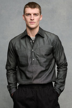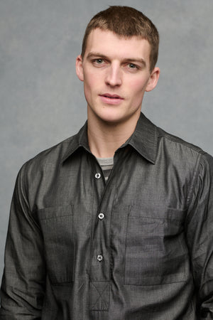 100% cotton 115gm. Please note: the denim used to make this shirt is heavily starched and will soften after the first wash