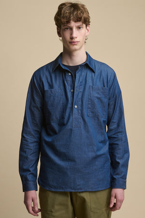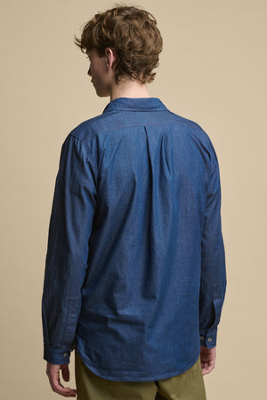 100% cotton 115gm. Please note: the denim used to make this shirt is heavily starched and will soften after the first wash.