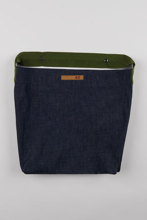 The denim pack-a-sack is made from lightweight denim, and the strap is nylon webbing.