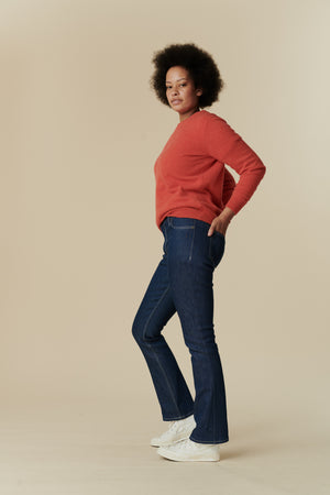Mid-rise waistline, cut close to the body through the thigh and knee, before kicking out to a subtle flare at the ankle. Olivia is wearing a size 14L Available in two leg lengths, Regular (29" inside leg) and Long (31" inside leg). We recommend taking a size up from your usual size.