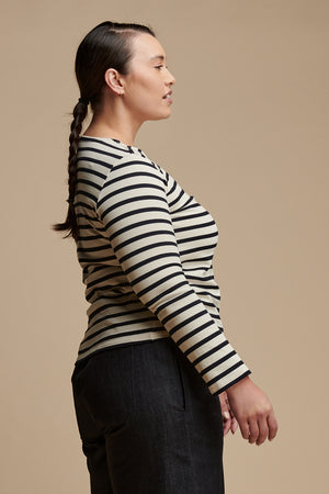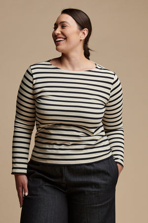 Standard fit. This garment is made from 100% natural cotton jersey. It is normal for this product to exhibit a small amount of shrinkage after the first couple of washes. This product may shrink by as much as one full size so we recommend that you size up from your regular size to allow for this shrinkage after washing. Sizes 20 and above have a curved hem. Lorelle is wearing a size 8. Isabella is wearing a size 18.