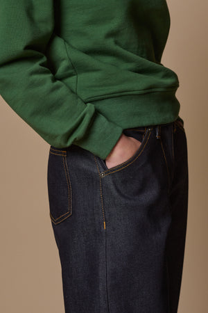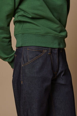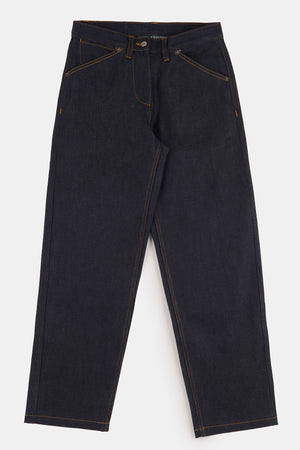 A super relaxed tapered wide legged jean with distinctive workwear detailing, the chore is a feminine take on the super popular men’s chore jean. It has a wide tapered roomy leg featuring a unique straight pocket mouth and curved change pocket.