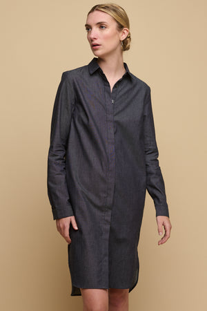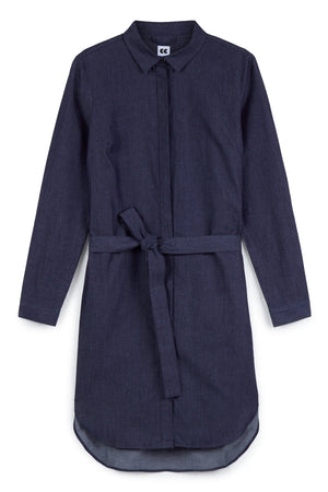Button front long sleeved shirt dress with collar, tie belt and two side pockets