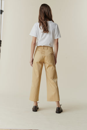 High waist, wide leg, cropped length, flat front. Slant side pockets, two rear pockets. Zip fly, button fastening at waist