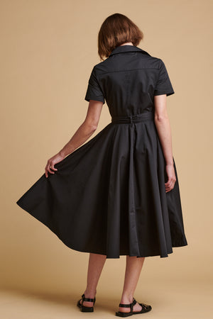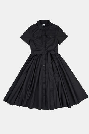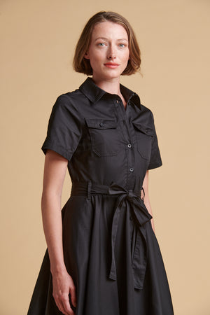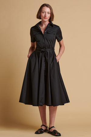 Short sleeve button through full skirted dress with belt and button down patch pockets