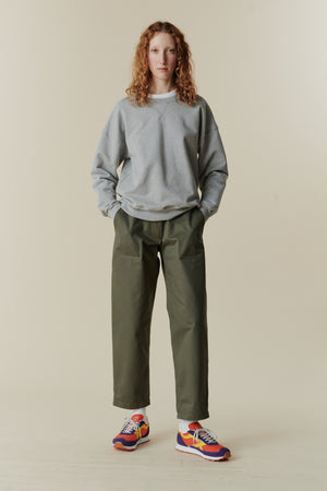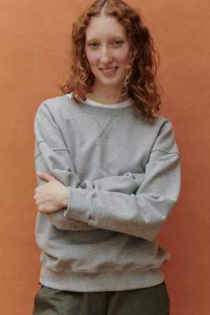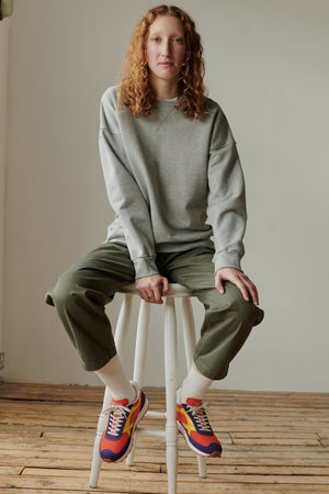 Crew neck, drop shoulder. Rib cuff, waist and neck