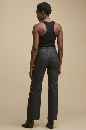 Contemporary high-rise waistline, cut close to the body to the thigh down into a wide leg. Our model Lily is 5'9'' and she is wearing size 10 regular