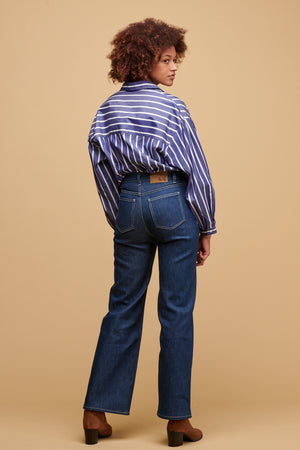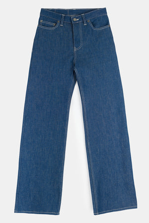 Five pocket jean with wide leg. Zip fly and rivets.