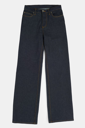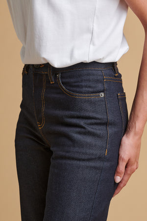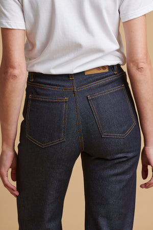 13.5oz denim, 95% Organic cotton 4% recycled polyester 1% elastane comfort stretch raw, unwashed denim