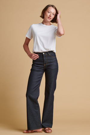 Contemporary high-rise waistline, cut close to the body to the thigh down into a wide leg. Our model Saskia is 5'8'' wearing size 8 regular.
