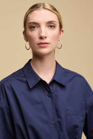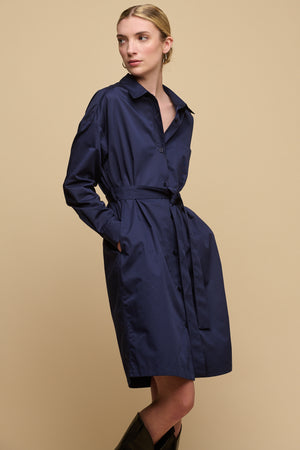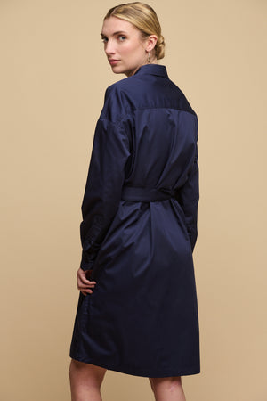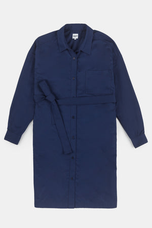 Shirt dress, long sleeve with buttoned cuff, two internal side pockets, detachable tie belt